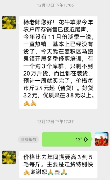 近期苹果市场动态调研得知。甘肃天水的花牛苹果卖的很好,出库很快。前两天,一位甘肃天水朋友发给我的微信如下,也反映了眼下花牛的销售情况很好:“花牛苹果今年农户库存销售已接近尾声,今年没有11月份淡季一说,一直热销,基本已经没有货了。麦积区马跑镇一个沟,三个库群。只剩下不到20万斤货,而且都在装货,预计一周左右就卖完了。价格,每市斤2.4元起。普货好货3.2元,优质货3.8元/每斤以上。价格比去年同期要高了3~5毛钱每斤,主要是走货特别快。”